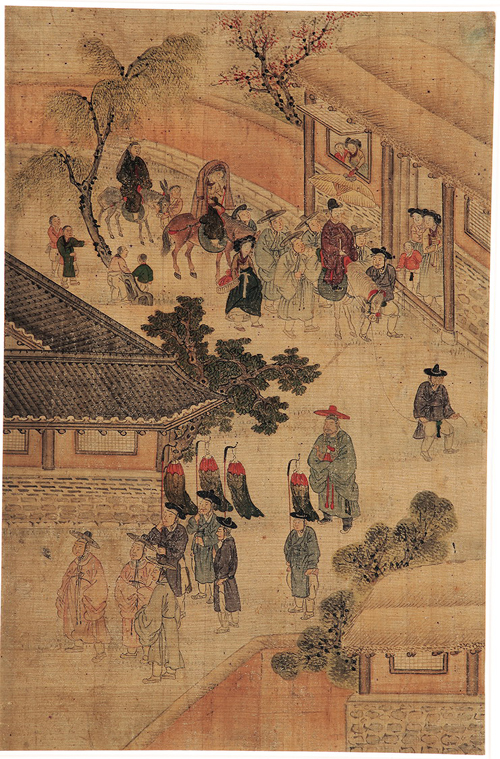 조선후기 대표적화가인 단원 김홍도(1745-1806)가 결혼식 행차 모습을 그린것이다. 인간 삶의 하이라이트라 할수 있는 결혼행렬앞에 기러기를 앞세우고 사모관대를 한 신랑과 신부가 말을타고가고 있다. 신랑신부의 행차를 집안이나 나무뒤에서 엿보는등 예리한 관찰이 돋보이는 작품이다. 조선시대 결혼식은 신랑이 아버지와 함께 사당에 가서 예를 올린 다음 처가로가서 혼인식을 올리고 첫날밤을 지낸후 신부와 함께 시집으로 돌아왔다. 국립중앙박물관 소장품.