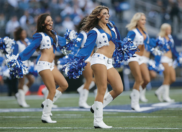 미 프로 미식축구(NFL) 달라스 카우보이스 치어리더들이 3일 미네소타 바이킹스와의 홈경기에서 경쾌한 율동을 선보이고 있다.