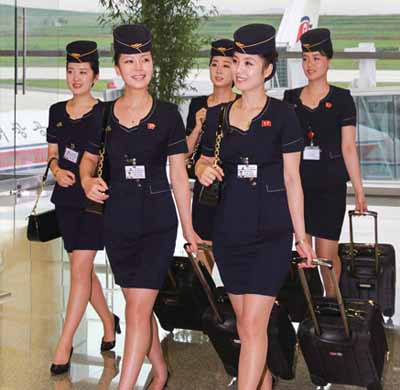 북한 고려항공 승무원들 '화사한 미소·세련된 치장' 북한 유일의 국제항공사인 고려항공 승무원들의 '화사한 미소'와 '세련된 치장'이 공개돼 눈길을 끈다. 31일 연합뉴스가 입수한 북한의 대외용 월간 화보 '조선' 9월호에는 다섯명의 여자 승무원들이 표지 모델로 등장했다. 표지에서는 지난 2013년 바뀐 짙은 감색의 유니폼을 차려입고 왼쪽 가슴에는 김일성·김정일 배지를 착용한 승무원들이 고려항공 여객기가 보이는 공항을 배경으로 캐리어를 끌고 걸어가고 있다. 2015. 8. 31