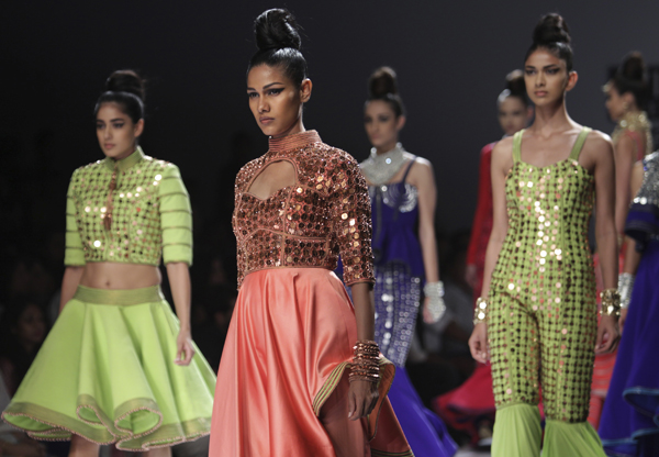 9일 인도 뉴델리에서 열린 인디아 패션위크 행사에서 모델들이 인도풍의 패션을 선보이고 있다.