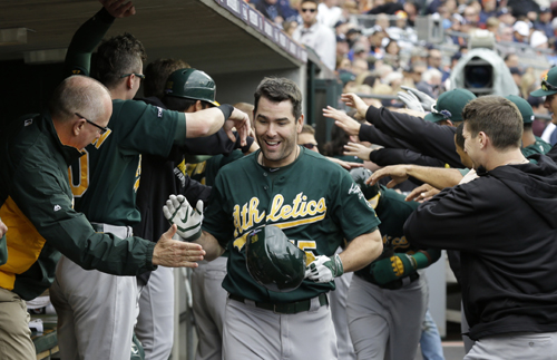 오클랜드 A's는 7일 디트로이트에서 타이거즈를 상대로 치른 아메리칸 리그 디비전 시리즈 3차전에서 6-3으로 승리하며 시리즈 전적 2-1로 앞서나가며 1승만 더 올리면 챔피언십 시리즈에 진출하게 된다. 오클랜드의 지명타자인 세스 스미스(15) 선수가 5회초 솔로 홈런을 친뒤 팀메이트들의 축하를 받고 있다.