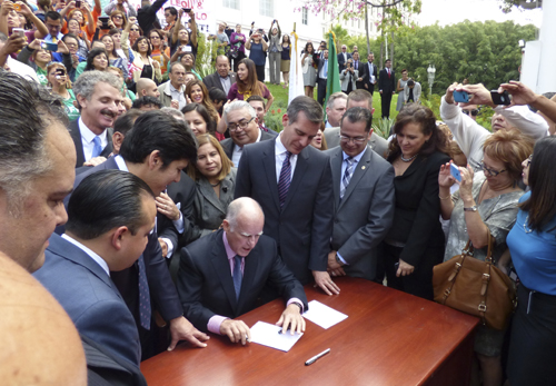 제리 브라운 주지사가 3일 LA시청에서 불체자들에게 운전면허증을 부여하는 법안을 수많은 이들이 지켜보는 가운데 서명하고 있다. 그러나 불체자 면허증은 일반면허증과 구분되며 신분증으로는 사용할 수 없다. 또 유권자 등록, 취업 또는 공공혜택 신청에도 사용할 수 없다.