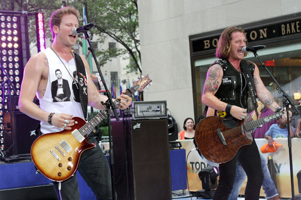 미국 컨트리뮤직 듀오‘플로리다 조지아 라인’의 브라이언 켈리(왼쪽)와 타일러 허버드가 2일 NBC 방송 인기프로‘투데이’ 쇼에서 공연하고 있다.