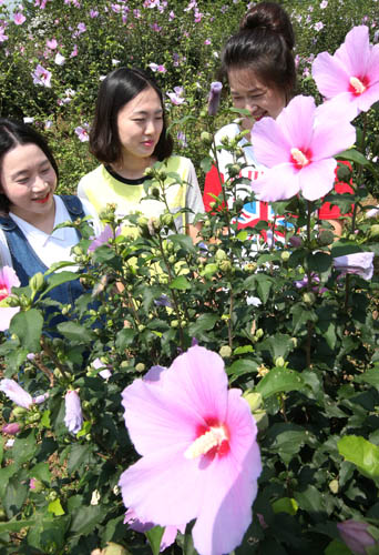 광복절을 하루 앞둔 14일 경기도 수원시 국립산림과학원 수원시험림의 만개한 한국산 무궁화를 과학원 관계자들이 살펴보고 있다.