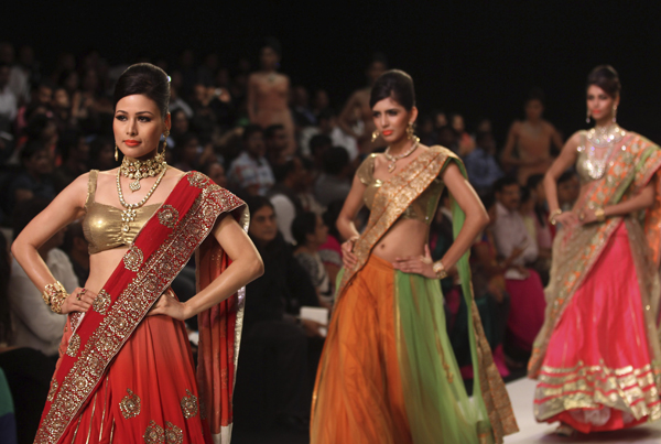 모 델들이 인도 뭄바이에서 열린 패션쇼에서 고급스러운 인도 전통 의상과 보석 패션을 선보이고 있다.