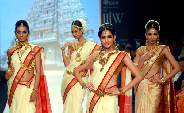 인도 뭄바이에서 4일 열린 제4회 인도 국제보석쇼에서 모델들이 독특한인도풍의 보석들을 선보이고 있다. < A P >