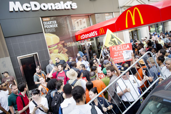 뉴욕시내 패스트푸드 업체에서 일하는 직원 수백명이 29일 맨하탄에서 시급인상과 노조보장을 요구하는 대규모 시위를 벌였다. 항의 포스터를 든 시위자들이 유니온 스퀘어 맥도널드 매장 근처를 행진하고 있다.