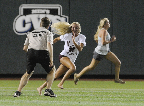 네브래스카 오마하에서25일 벌어진 미시시피 스테이트와 UCLA와의 대학 야구 결승전2차전에서 미시시피 스테이트팬들이 필드를가로지르면 뛰어가자 진행요원이잡으려 하고 있다. < A P >