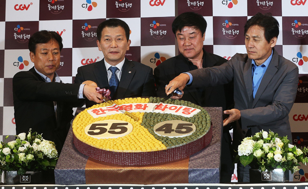 중 국 여배우 바이바이허(29)와 대만 배우 펑위엔(31)이 20일 서울서 자신들이 출연한 영화‘이별계약’의 홍보행사에서 한국 팬들을 위해 하트를 그려 보이고 있다. < A P >