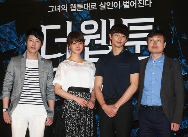 배우 엄기준(왼쪽부터), 이시영, 현우, 김용균 감독이 17일 서울 성동구 행당동CGV 왕십리에서 열린 영화 더' 웹툰: 예고살인' 언론시사회에서 포즈를 취하고 있다.
