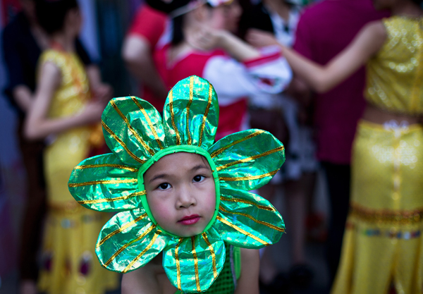 1일 국제 어린이날을 맞아 중국 외무부가 베이징의 어린이궁에서 마련한 축하행사에서 한 아이가 해바라기 마스크를 자랑하고 있다.