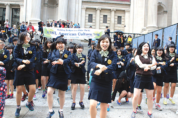 뉴욕을 방문 중인 한국 수원외국어고교 학생 98명이 9일 맨하탄 메트로폴리탄 박물관 앞에서 싸이의 ‘강남스타일’과 ‘젠틀맨’ 플래시몹을 펼쳤다. 학생들은 플래시몹이 끝난 후 독도 알리기 홍보캠페인도 벌였다. 학생들이 싸이 ‘강남스타일’과 ‘젠틀맨’ 춤을 따라 하는 플래시몹을 선보이고 있다.