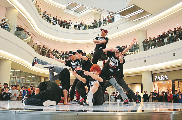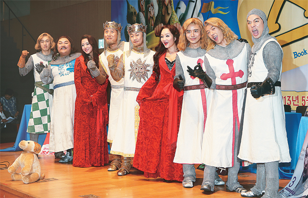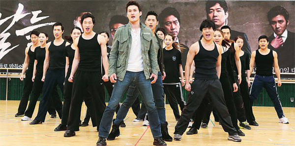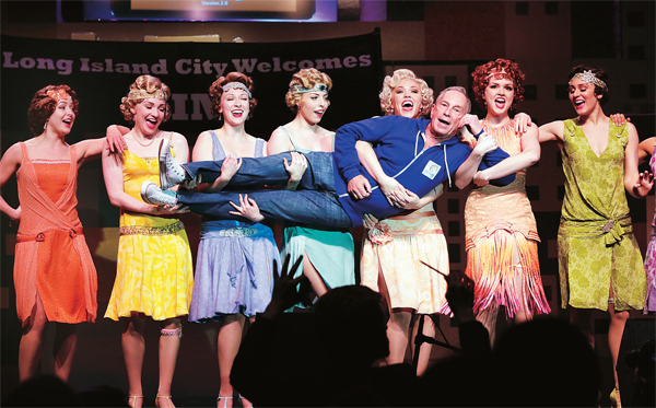 마이클 블룸버그 뉴욕 시장이 뉴욕 브로드웨이에서 상연중인 연극에서 미녀들과 즐겁게 춤을 추고 있다.