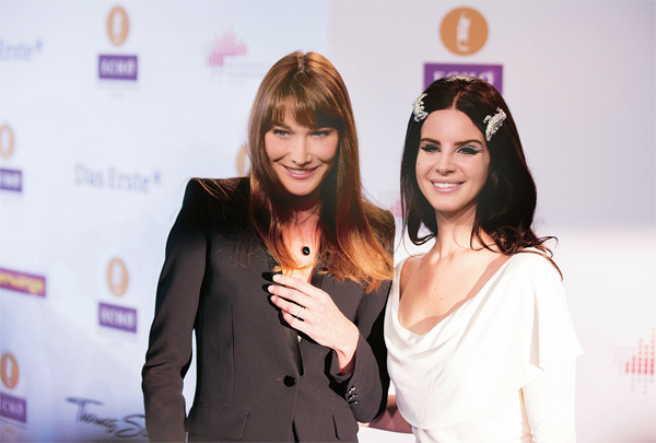 가수 및 모델 출신으로 니콜라 사코지 전 프랑스 대통령의 부인인 칼라 부르니(왼쪽)가 독일 베를린에서 열린 음삭 시상식에서 미국 가수 라나 델레이와 환하게 웃고 있다. < A P >