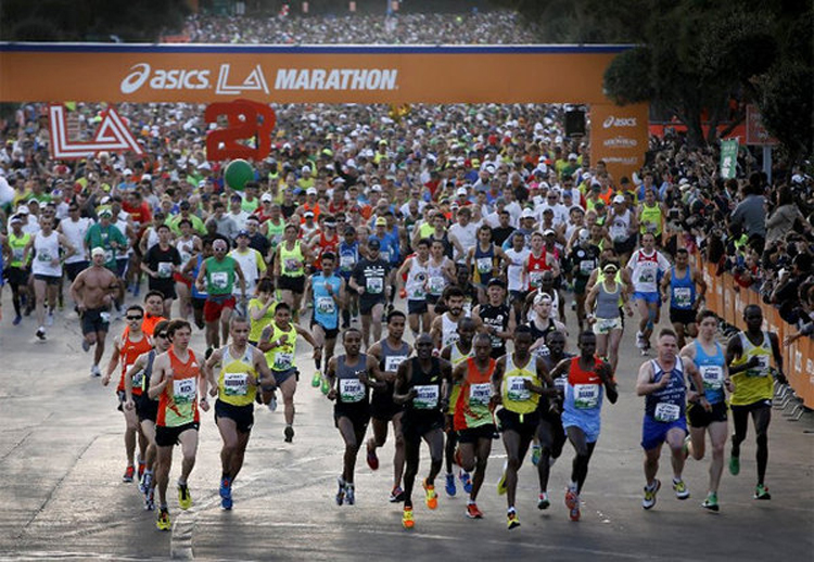 17일 로스앤젤레스에서 열린 '28회 아식스 LA 마라톤'에서 전국 50개주 세계 61개국에서 모인 선수들이 출발점인 다저스태디움을 출발하고 있다.