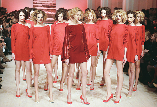12일 뉴욕에서 열린 '마이클 콜스 2013 봄 컬렉션'에서 모델이 빨간 색깔의 드레스와 가방. 또 올해 유행하는 뾰족한 신발 조합을 선보이고 있다.