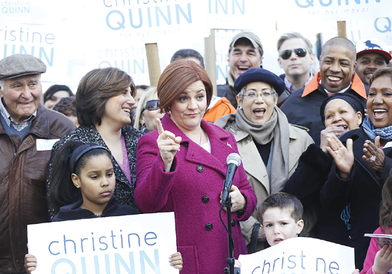 크리스틴 퀸 뉴욕시의회 의장이 10일 뉴욕시장 출마를 공식 선언했다. 퀸 의원은 이날 공식출마 발표 후 5개 보로를 돌며 유세를 펼쳤다. 퀸 의장은 현재 각종 여론 조사에서 지지율 1위를 달리고 있다. 퀸 의장이 오는 11월 시장 선거에서 승리할 경우 사상 첫 여성이자 동성애자인 뉴욕시장이 탄생한다. 퀸 의장이 출마를 공식 선언하고 있다.