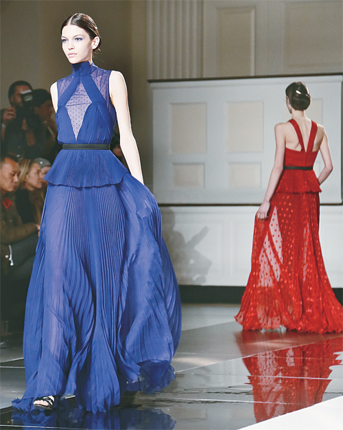 뉴욕에서 열리고 있는 2013년 가을 컬렉션 패션쇼'에서 모델들이 제이슨우가 디자인한 우아한 드레스들을 선보이고 있다.