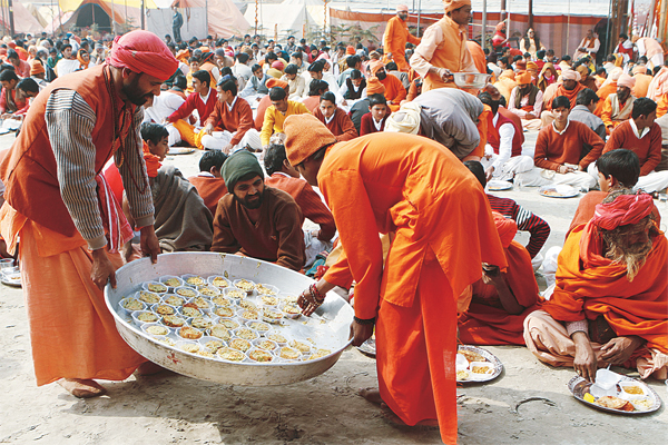 인도 알라바드 지역에서 24일 힌두교 최대의 행사 중 하나인 마하 쿰 페스티벌에참석한 힌두교도들이 단체로 식사를 하고 있다. 이 행사는 12년 만에 한 번씩 열리며 55일간 진행되는데 간지스 강에서 죄를 씻는 의미로 목욕재계를 하는 것이 하이라이트이다.