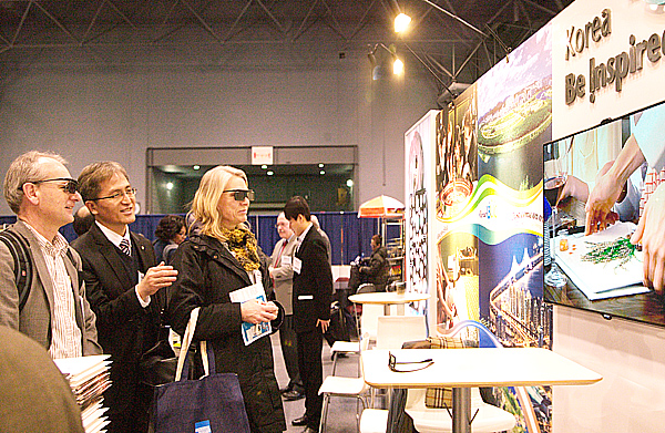 한국관광공사 뉴욕지사가 미 동부 최대 관광 전시행사인 '2013 뉴욕타임즈 여행 박람회'에 '한국홍보관'을 설치했다. 맨하탄 제이콥 재비츠 센터에서 18일부터 20일까지 열리는 이번 박람회에서 관광공사는 한식, 태권도, 순천만 국제정원박람회, 부산·울산 방문의 해, 강남스타일 체험 등의 테마로 한국을 홍보할 예정이다. 18일 한국홍보관을 찾은 외국인들에게 성필상(가운데) 관광공사 차장이 '3D 홍보영상'을 보여주고 있다.