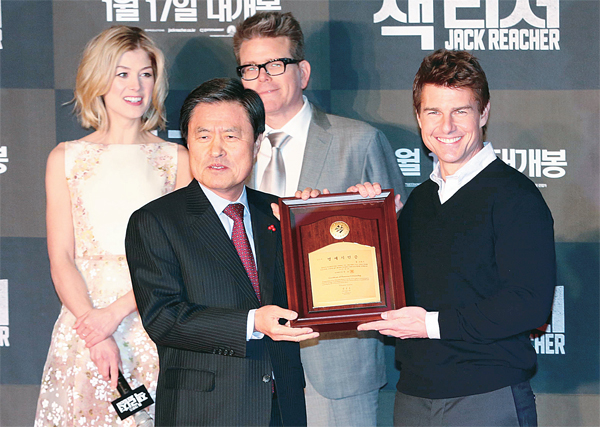 액션영화‘잭 리처’ 홍보차 방한한 할리웃 스타 탐 크루즈가 10일 부산 해운대구 영화의 전당에서 열린 레드카펫 행사에 참석해 허남식 부산시장이 주는 명예시민증을 받고 기념촬영을 하고 있다.