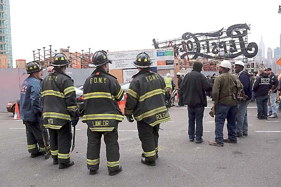 퀸즈 롱아일랜드시티 강변가 아파트 공사 현장에서 9일 발생한 크레인 붕괴 사고 현장에서 소방대원들이 구조 활동을 펼치고 있다.