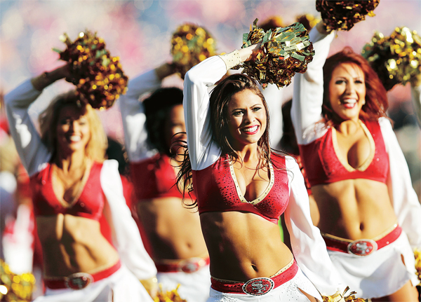 잭슨빌 재규어스 치어리더가 뉴욕 제츠와의 풋볼 경기 하프타임에 나와 멋진 춤을 추고 있다.