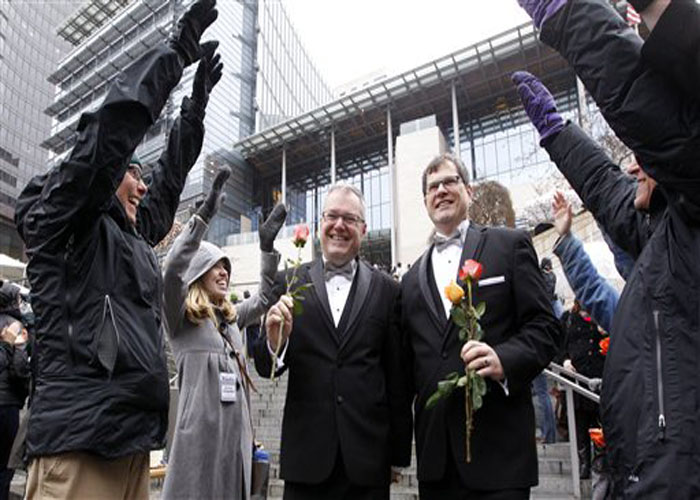 게이커플로 9일 워싱턴주 시애틀 시청에서 결혼식을 올린 테리 길버트(왼쪽)와 폴 베플러씨가 결혼식후 하객들의 환호를 받으며 걸어나오고 있다. 크리스 그레고어 워싱턴주 주지사는 주민발의안으로 통과된 동성커플 결혼 허용안에 지난 5일 서명을 했다. 이날 워싱턴주 사상 처음으로 결혼식을 올린 동성커플들은 지난 5일 결혼증명서를 받은 후 3일간의 유예기간이 끝난 이날 결혼식을 올렸다.