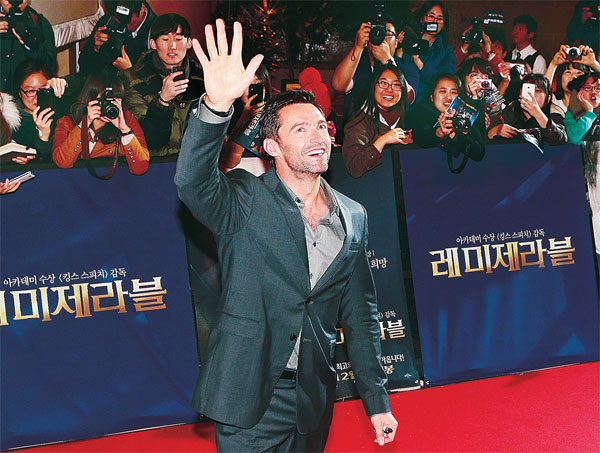 배우 휴 잭맨이 26일 서울 강남구 역삼동 리츠칼튼 호텔에서 열린 영화 '레미제라블' 팬 미팅 행사에서 한국 팬들에게 인사하고 있다.