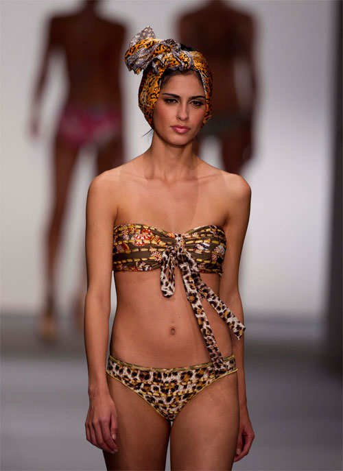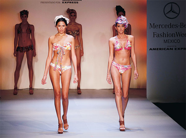 12일 멕시코에서 열린 머세데스 벤츠 패션쇼에서 미녀 모델들이 디자이너 피녜다 코발린의 의상을 선보이고 있다.