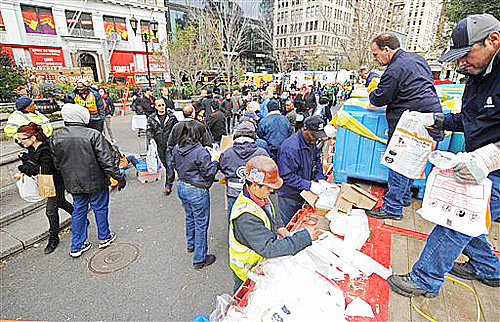 1일 유니온 스퀘어에서 콘에디슨사가 첼시 지역의 정전 가구 주민들에게 드라이 아이스를 나눠주고 있다. 허리케인 샌디가 휩쓸고 지나간 지 3일째지만 여전히 많은 가구와 비즈니스들이 정전 피해를 겪고 있다.