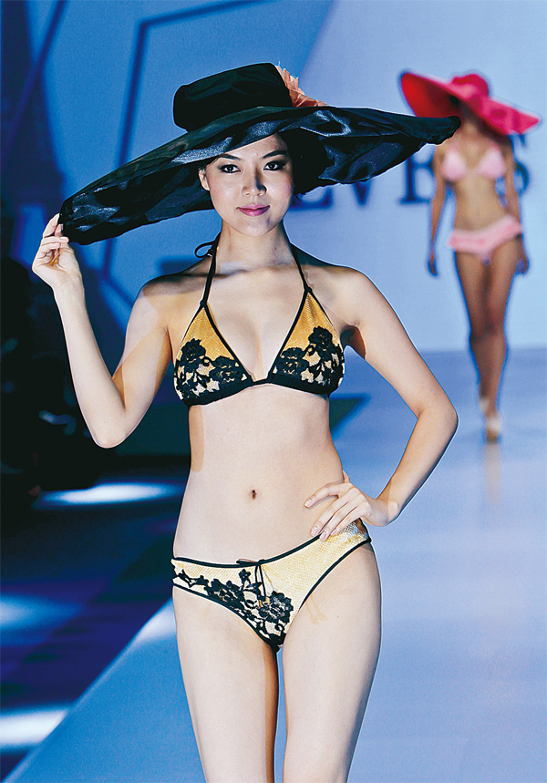 22일 중국 상하이에서 열린 패션쇼에서 젊은 모델이 비키니 모양의 최신 란제리를 선보이며 섹시한 자태를 뽐내고 있다.