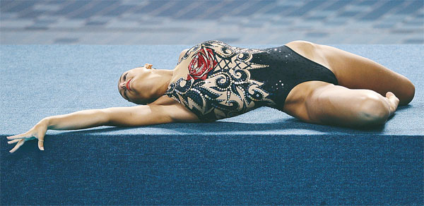 두바이에서 열리고 있는 싱크로나이지드 수영 선수권 대회에서 12일 그리스 선수고 솔로 부분에 출전에 연기하고 있다.