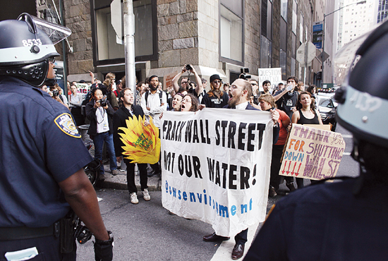 월스트릿 점령 시위(OWS) 1주년을 맞은 17일 맨하탄 곳곳에서 시위가 벌어져 주코티 공원과 뉴욕증권거래서(NYSE) 인근 등에 약 1,000명의 시위대가 집결, 경찰과 대치했다. 이 과정에서 일부 시위대가 경찰과 벌이기도 했지만 전반적으로 폭력 양상은 나타나지 않았다. 시위에 나선 시민들이 플래카드와 피켓 등을 들고 자신들의 주장을 외치고 있다.