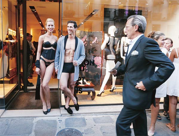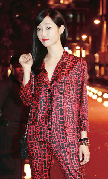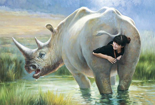 중국의 한 3차원 그림 전시회에서 관람객이 코뿔소 그림에 얼굴을 내밀며 신기한 듯 바라보고 있다.