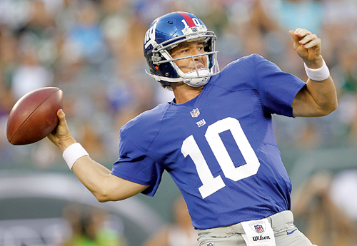 미 프로풋볼(NFL) 뉴욕 자이언츠가 뉴욕제츠와의 프리시즌 시범경기에서 완승을 거두며 자존심 대결에서 26-3으로 승리했다. 자이언츠 쿼터백 일라이 매닝이 1쿼터 팽스를 하려 하고 있다.(AP)