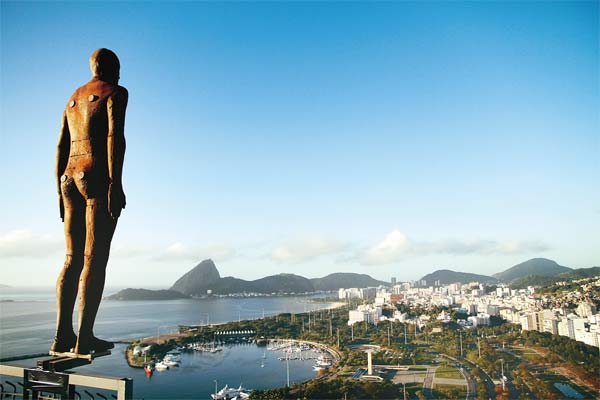 영국 작가 안토니 곰리의 조각상이 16일 리우데자네이루의 관나발라베이의 로프마운틴에 세워져 있다.