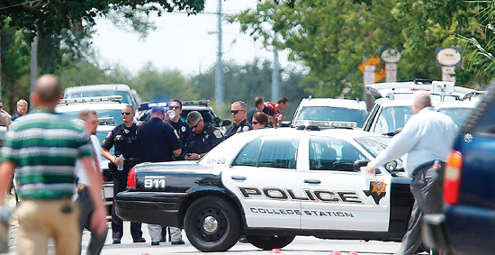 텍사스주 칼리지스테이션의 텍사스 A&M 대학 인근에서 무장 괴한이 총격을 가해 경찰관 1명과 시민 1명이 목숨을 잃는 사건이 13일 발생했다. 범인은 경찰총격을 받은 뒤 병원으로 이송 중 사망했다. 총격이 벌어진 현장주변에 경찰들이 모여 있다.