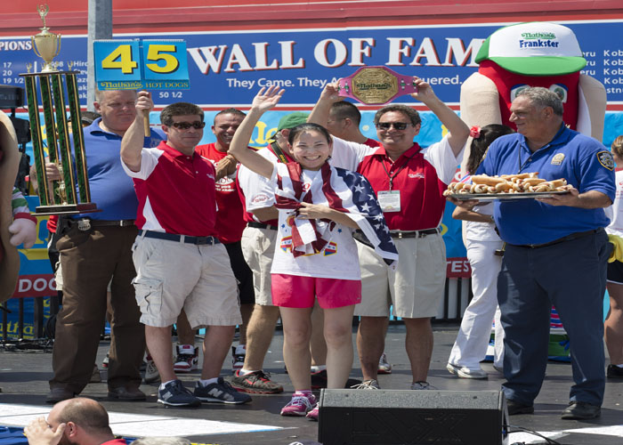 독립기념일을 맞아 열린 '핫도그 먹기대회'에서 45개의 핫도그를 먹어 우승을 차지한 한인 이선경씨가 트로피를 들고 관계자들로부터 축하를 받고 있다.