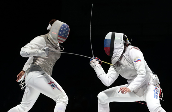 16일 러시아 모스크바에서 열리고 있는 세계 펜싱 선수권대회에서 미국 선수와 러시아 선수가 겨루고 있다.