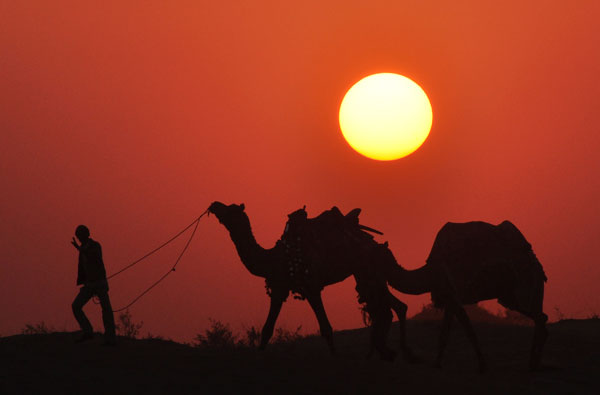 인도 비카네에서 열리고 있는 연례 낙타페스티벌에 참가했던 한 마을 주민이 집으로 돌아가고 있다.