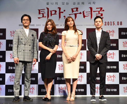 14일 오전 서울 강남구 CGV 압구정점에서 열린 영화 ‘퇴마; 무녀굴’ 제작보고회에서 출연진(왼쪽부터 김성균, 유선, 차예련, 김예성)이 사진촬영을 하고 있다.