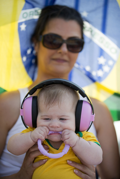 캐나다에서 열리고 있는 팬암 게임에서 13일 한아기가 브라질 비치발리볼 예선전 경기를 지켜보는 엄마의 무릎 위에 앉아 열심히 무언가를 물고 있다.